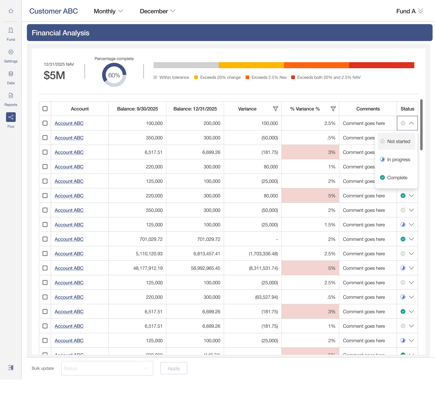 The customer dashboard allows users to track the status of data at different stages of a workflow and drill down into specific funds for detailed financial analysis.